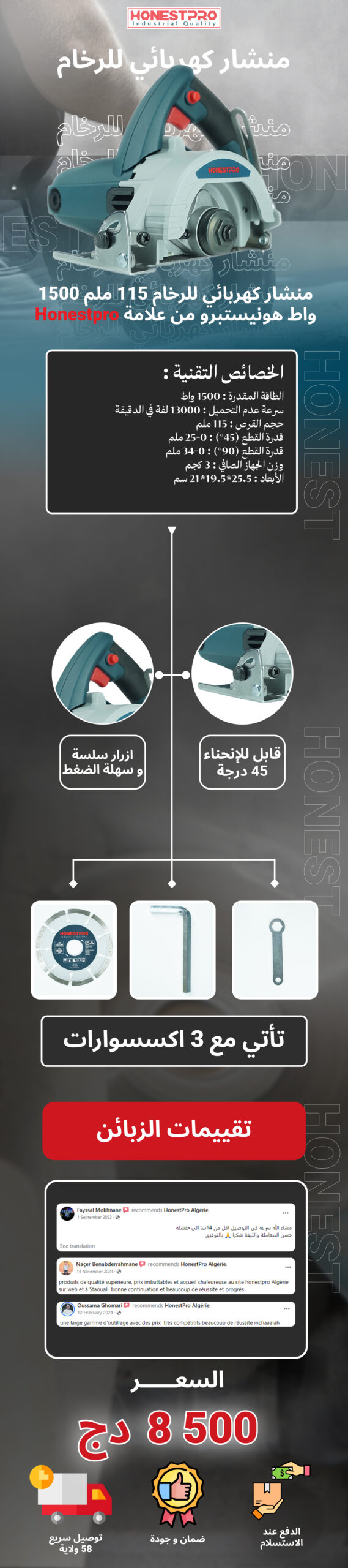 Bienvenue dans notre boutique spécialisée en vente d’équipements de la marque HonestPro en Algérie. En tant que distributeur officiel de la marque HonestPro, nous vous proposons une sélection exclusive de produits de haute qualité. Que vous soyez un professionnel exigeant ou un particulier passionné par le bricolage, notre magasin offre une gamme complète d’outils fiables et performants. Parcourez notre inventaire pour découvrir des équipements pour tous les besoins, allant des outils à main précis aux solutions innovantes d’outillage électroportatif. Faites confiance à la qualité HonestPro pour vous accompagner dans toutes vos tâches. Nous sommes fiers de vous servir et de vous offrir des produits de pointe pour vous faciliter le travail et répondre à vos exigences.